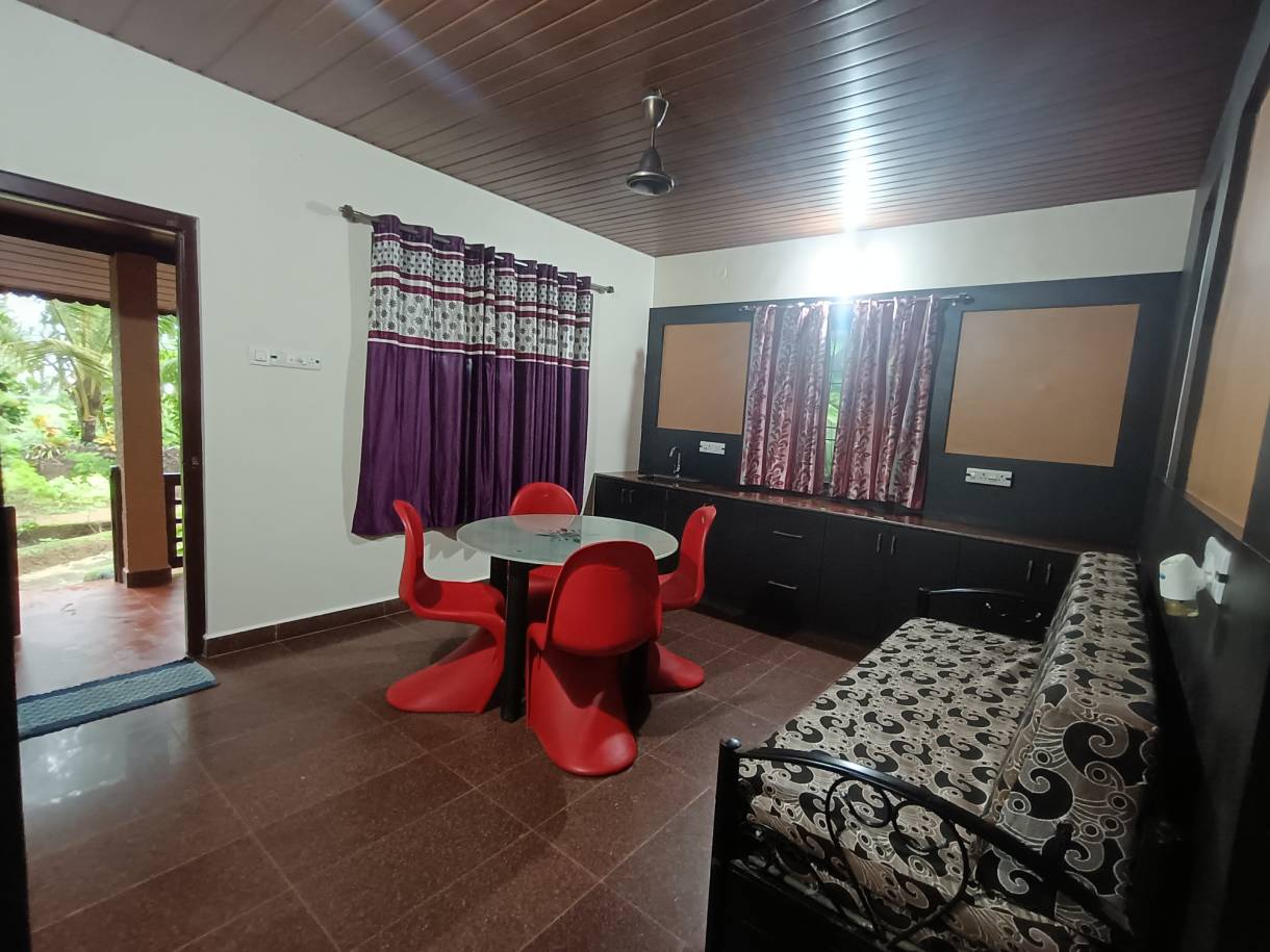 The Suite Room is perfect for families or groups wanting spacious accommodation at Aura Ecostay Resorts. With two separate rooms in one suite, two attached bathrooms, and a dining hall, it offers ample space for everyone to relax and dine together. Designed for comfort and privacy, it’s ideal for guests who want to enjoy extended stays surrounded by nature while staying close to the Arabian Sea.